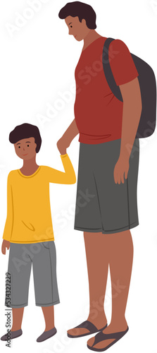 Dad holding boys hand. Family walking in city park together scene. Parents and children, outdoor activity concept. Vector isolated people characters outdoors. Family leisure. Man stands with his son