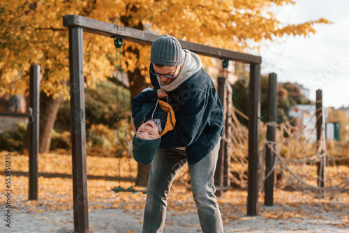 Dad holding his son in the hands. Father and young son is together outdoors at daytime