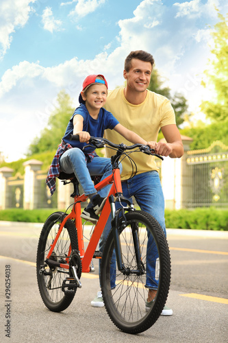 Dad teaching son to ride bicycle outdoors