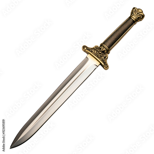 dagger with an ornate golden handle and a sharp isolated on a white background.