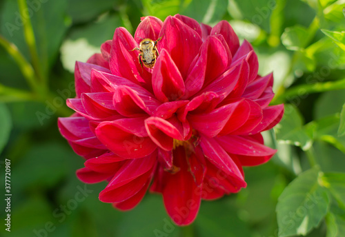 Dahlia red flower with bee
