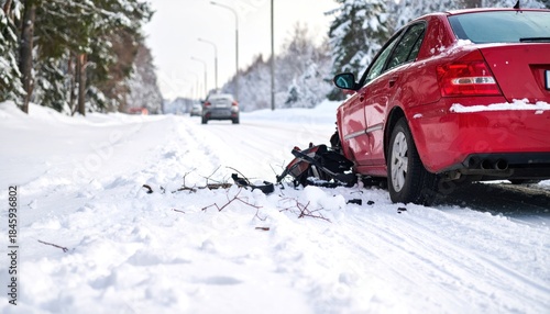 car, accident, snow, winter, road, crash, damaged, vehicle, collision, driving, danger, safety, insurance, debris, broken, icy, slippery, cold, emergency, transportation, risk, problem, hazard, unfortunate, red car, impact, bad luck, incident, white, tree, street light, bumper, headlamp, roadside, frost, freezing, crisis, auto, road safety, caution