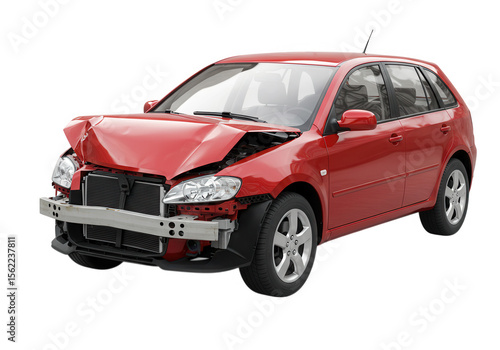 Damaged red hatchback car isolated on transparent background