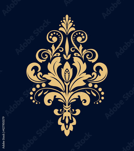 Damask graphic ornament. Floral design element. Gold and dark blue vector pattern