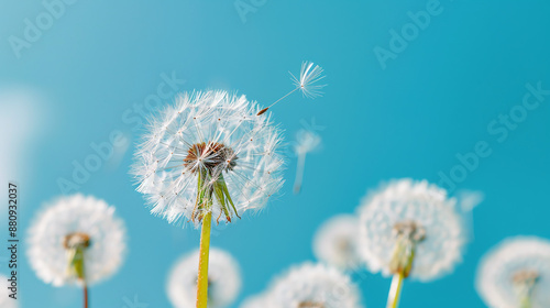 dandelions agains bright blue sky, concept of freedom of movement and transformation