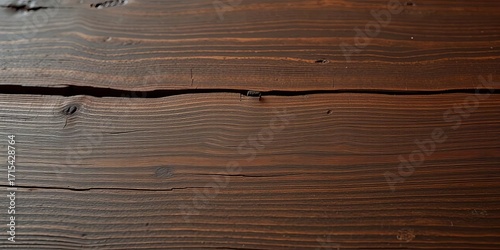 Dark, aged wood table top, rich grain and texture visible, wood grain, top view