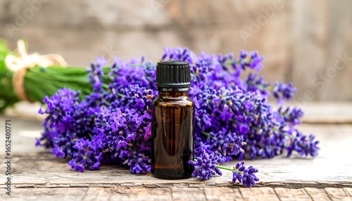 Dark amber glass bottle of lavender essential oil nestled amongst a bouquet of purple lavender flowers.