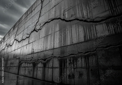 concrete, wall, fractured, dark, dramatic, rain, texture, damage, structure, decay, fissure, prominent, streak, grunge, weathered, broken, bankruptcy, construction, surface, abstract, monochrome, black-and-white, grey, wet, water, urban, background, architecture, rough, cement, material, detail, pattern, perspective, stormy