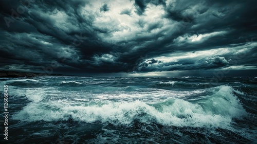 Dark and Dramatic Seascape Under Stormy Clouds with Turbulent Waves Crashing Against Each Other on a Gloomy Day by the Ocean's Shoreline