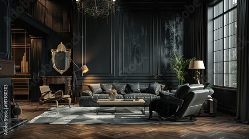living, room, interior, design, luxury, furniture, modern, home, decor, black, gold, couch, armchair, carpet, window, fireplace, lamp, chandelier, mirror, dark, elegant, stylish, comfortable, decoration, house, apartment, posh, sophisticated, art, style, beautiful, vintage, retro, contemporary, classic, minimalism, cosy, bright