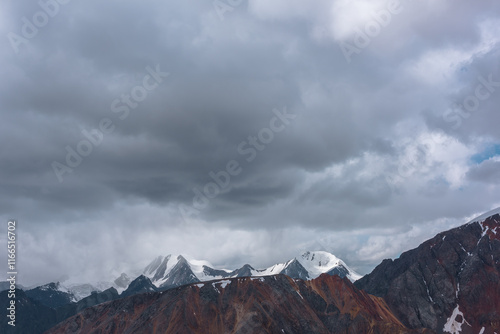 Dark atmospheric alpine landscape with sharp rocky ridge and snowy peaked tops in low heavy lead gray cloudy sky. Rock mountain wall and snow-capped pointy peaks in bleak dramatic bad rainy weather.