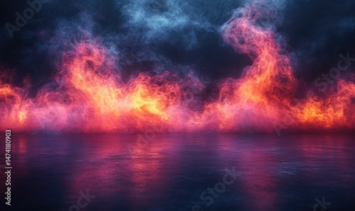 fire, smoke, dark, glow, vibrant, colours, light, texture, scene, atmosphere, dramatic, abstract, lighting, glowing, flames, red, orange, pink, blue, purple, floor, surface, motion, energy, powerful, intense, visual, effect, design, background, fog, vapour, heat, cool, contrast, imagination, digital, rendering, artistic