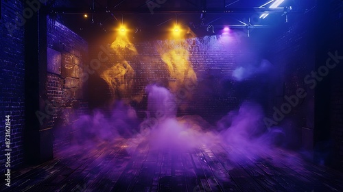 Dark basement, rustic brick walls, yellow sparks of fire, light flickering on the wooden floor, heavy smoke, neon purple lamps, night scene, ultra hd high quality image