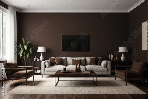 Dark brown living room with a cool minimalistic design and copy space.