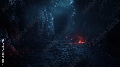 cave, path, lava, dark, glowing, rock, tunnel, mysterious, fantasy, adventure, inferno, hell, fire, gloom, shadow, horror, mystery, danger, obscure, deep, underground, journey, exploration, alien, eerie, skittish, night, darkness, red, blue, texture, background, scene, environment, science fiction, game, concept, digital, art, design, image, illustration, abstract, dramatic, epic
