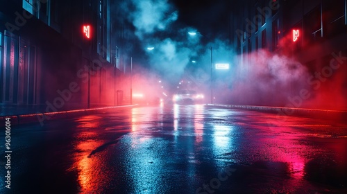 Dark empty street with wet asphalt reflecting neon lights and smoke, abstract night scene with searchlight and smog, perfect for moody urban designs, cinematic visuals, and atmospheric cityscapes.