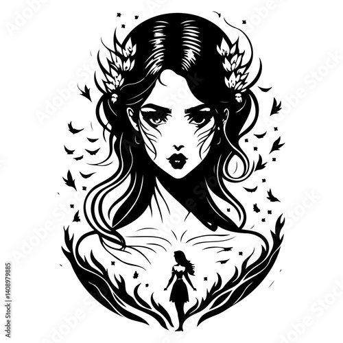 enchantress, portrait, vector, illustration, art, woman, black, white, fantasy, design, mystical, female, graphic, beauty, elegant, gothic, silhouette, character, goddess, stylised, magical, mysterious, artistic, darkness, aethereal, creative, drawing, digital, ink, fairy tale, floral, nature, bird, abstract, modern, monochrome