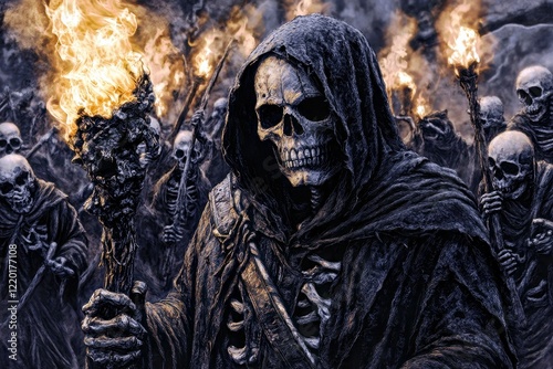 skeleton, torch, fire, dark, fantasy, eerie, skittish, portrait, hooded, skull, night, atmospheric, horror, ancient, ghostly, light, shadow, gathering, death, ominous, chilling, nature, mediaeval, surreal, haunting, adventure, landscape, mystery, decay, supernatural, dramatic, timeless, ritual, fear, grim, aethereal, smoke, storm, figure, wild, twilight, dusk, visual, art, concept, narrative