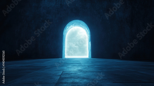 dark, gloomy space features glowing portal that leads to bright, cloudy sky, evoking sense of mystery and intrigue. contrast between darkness and light creates emotional tension