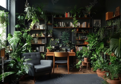 Dark gray home office with plants, a gray armchair, and a wooden desk with a computer on it. Modern interior design of a contemporary living room