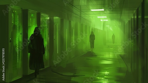 Dark green-lit data center corridor with mysterious figures walking past glowing servers. Concept of cybersecurity, hacking, encrypted networks, and futuristic digital security...