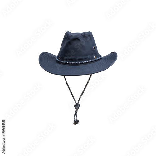 Dark grey cowboy hat with decorative trim and adjustable drawstring for outdoor sun protection