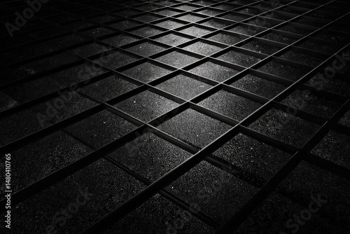 dark, grid, floor, metal, square, reflections, light, pattern, texture, surface, black, grey, shadow, line, industrial, geometric, architecture, design, abstract, modern, patterned, perspective, illumination, framework, structure, detail, contrast, metallic, polished, spot, beam, darkened, shadow, illuminated, detail
