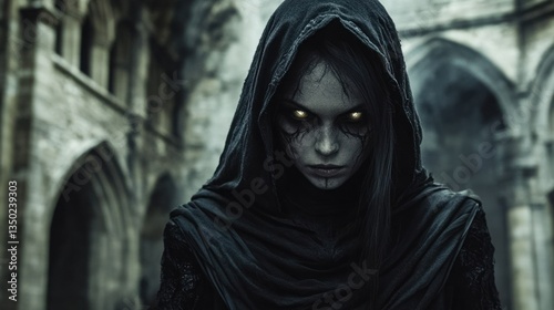 creepy, gothic, dark, woman, hooded, scarey, evil, daemon, ghost, sorcerer, monster, fantasy, mediaeval, ancient, religious, church, cathedral, ruined, decayed, haunted, mystery, horror, silhouette, skittish, supernatural, glowing, eye, face, figure, shadowy, night, grim, sinister, danger, fear, unknown, paranormal, occult, threat, ominous, mythical, spiritual, halloween, eerie