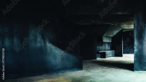 Dark Moody Interior with Textured Walls and Geometric Structures image photo