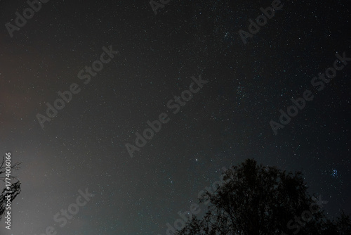 Dark night sky above tree silhouettes shows Pleiades cluster and a faint vertical chain near it, captured late at night with long exposure and minimal light pollution.