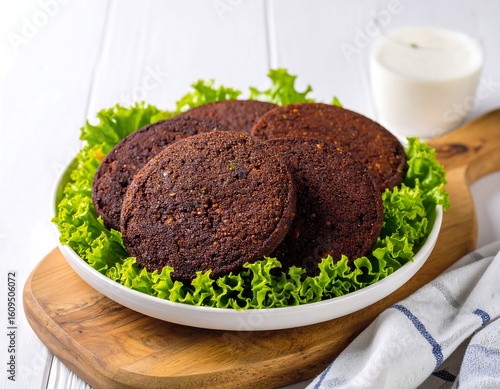 patty, dark, food, round, lettuce, plate, wooden, background, white, healthy, delicious, tasty, vegan, vegetarian, protein, meal, dish, closeup, fresh, homemade, organic, nourishment, cookery, dinner, snack, savoury, baked