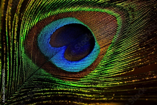 Dark peacock feather closeup. Feather isolated. Krishna Janmashtami background.