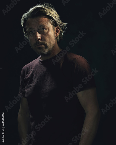 Dark portrait of a tough man with blond hair and a gray stubble in a dark brown t-shirt.