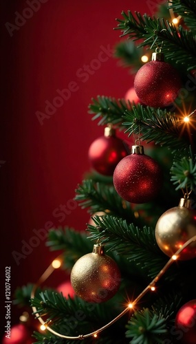 Dark red Christmas tree with golden ornaments and glittering lights, holiday, ornaments