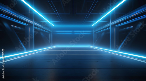 Dark room with blue neon lights on the ceiling, futuristic spaceship hallway