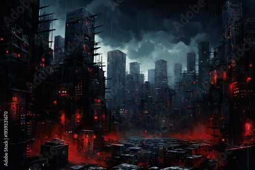conceptual, fantasy, abstract, red, rain, industrial, dark, city landscape, futuristic, city, light, architecture, digital, artificial, cyber, modern, technology, neon, grunge, virtual, night, street, urban, computer, intelligence, pollution, glowing, building, decay, apocalypse, ruin, people, environment, science, future, fiction, fi, mystery, scene, atmosphere, skyscraper, rainy, metropolis, dramatic, no, graphic