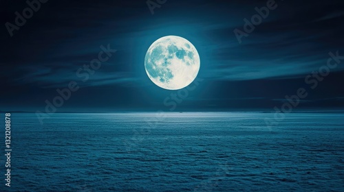 Dark sky concept. Stunning night view of a bright moon reflecting on calm ocean waters.
