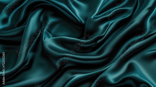 Dark teal green silk satin. Shiny smooth fabric. Soft folds. Luxury background with space for design. web banner. Flat lay, top view table. Birthday, Christmas
