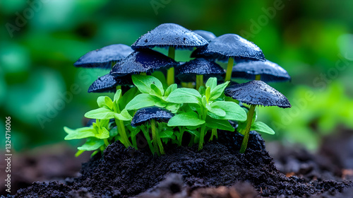 mushroom, fungal, nature, forest, dark, vibrant, flocked, growth, wildlife, wet, closeup, detail, plant, green, leaf, dirtied, earth, organic, mycology, macro, biology, ecology, environment, photo, image, picture, rain, water, black, blue, texture, beauty
