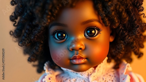Dark-Skinned Doll: Warmly Lit Portrait, Expressive Eyes, Curly Hair