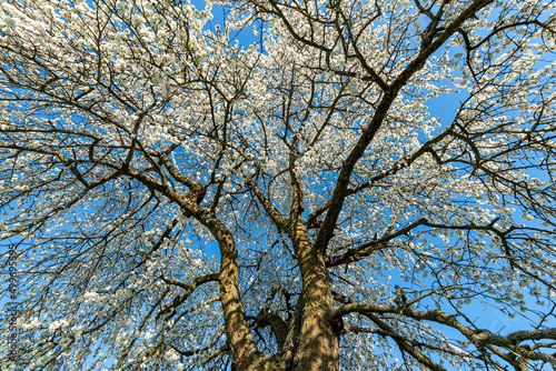Das Geäst eines blühenden Kirschbaums im Frühling mit weißen Blüten vor blauem, wolkenlosem Himmel