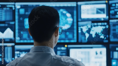 Data analysis in a high-tech control room urban center digital media corporate environment focused viewpoint technology trends