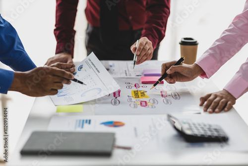 Data analysis, marketing strategy or statistics by business development leaders planning company growth. Hands of finance managers in a meeting discussing about financial performance in office.