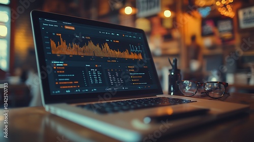 Data Analysis on Laptop in Modern Workspace, A person analyzing data on a laptop screen displaying various colorful graphs and charts