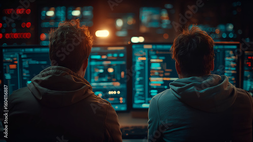 Data Analyst Collaboration: Two individuals immersed in data analysis, diligently examining complex information on multiple computer monitors, bathed in the cool glow of technology.