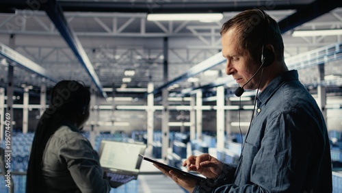 Data center admin talking in audio headset mic, helping clients resolve website hosting problems. Server farm worker on industrial platform helping users keep online services running, camera A