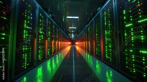 Data center server room corridor, glowing lights, technology, network infrastructure, digital