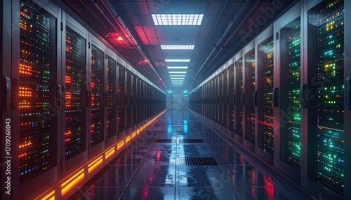 Data Center Server Room with Rows of Lit Servers and Network Cables in Blue and Orange Light