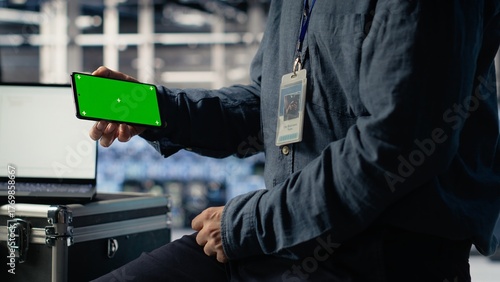 Data center worker uses isolated screen smartphone while deploying deep learning software. Server hub employee uses chroma key mobile phone while training AI systems with datasets, camera B