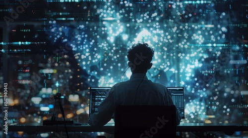Data science and big data technology. Scientist computing, analysing and visualizing complex data set on computer. Data mining, artificial intelligence, machine learning, business analytics.